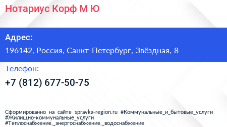 Нотариус Корф М.Ю. по адресу 196142, Россия, Санкт-Петербург, Звёздная, 8 в дальнейшем Организация, размещена в следующих категориях: