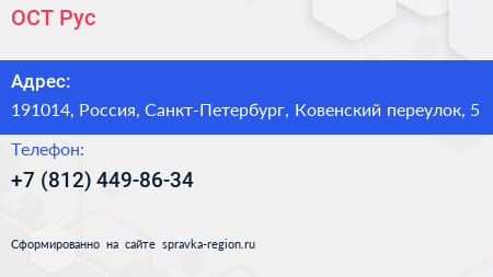 ОСТ Рус по адресу 191014, Россия, Санкт-Петербург, Ковенский переулок, 5 в дальнейшем Организация, размещена в следующих категориях: