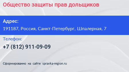 Общество защиты прав дольщиков по адресу 191187, Россия, Санкт-Петербург, Шпалерная, 7 в дальнейшем Организация, размещена в следующих категориях: