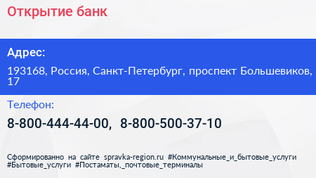 Открытие, банк по адресу 193168, Россия, Санкт-Петербург, проспект Большевиков, 17 в дальнейшем Организация, размещена в следующих категориях: