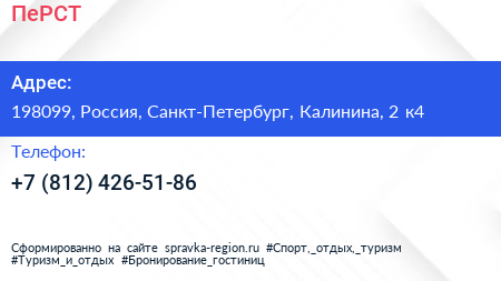 ПеРСТ по адресу 198099, Россия, Санкт-Петербург, Калинина, 2 к4 в дальнейшем Организация, размещена в следующих категориях: