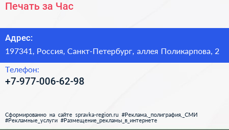 Печать за Час по адресу 197341, Россия, Санкт-Петербург, аллея Поликарпова, 2 в дальнейшем Организация, размещена в следующих категориях: