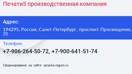 Печати5, производственная компания по адресу 194295, Россия, Санкт-Петербург, проспект Просвещения, 35 в дальнейшем Организация, размещена в следующих категориях: