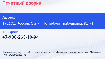 Печатный дворик по адресу 192131, Россия, Санкт-Петербург, Бабушкина, 81 к1 в дальнейшем Организация, размещена в следующих категориях:
