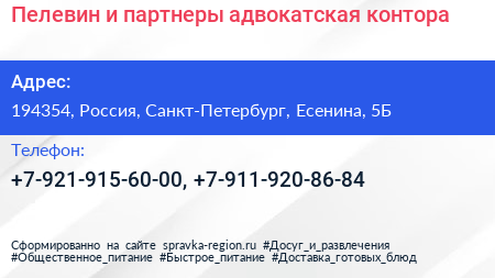 Пелевин и партнеры, адвокатская контора по адресу 194354, Россия, Санкт-Петербург, Есенина, 5Б в дальнейшем Организация, размещена в следующих категориях: