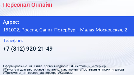 Персонал.Онлайн по адресу 191002, Россия, Санкт-Петербург, Малая Московская, 2 в дальнейшем Организация, размещена в следующих категориях: