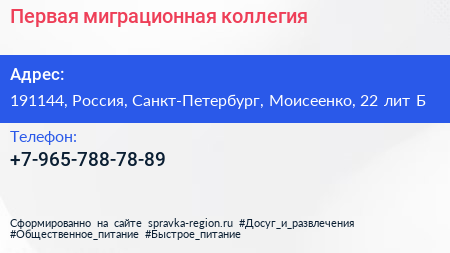 Первая миграционная коллегия по адресу 191144, Россия, Санкт-Петербург, Моисеенко, 22 лит Б в дальнейшем Организация, размещена в следующих категориях:
