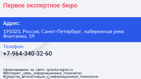 Первое экспертное бюро по адресу 191023, Россия, Санкт-Петербург, набережная реки Фонтанки, 59 в дальнейшем Организация, размещена в следующих категориях: