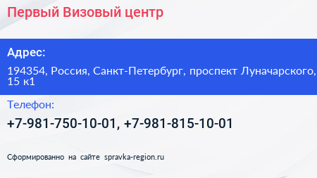 Первый Визовый центр по адресу 194354, Россия, Санкт-Петербург, проспект Луначарского, 15 к1 в дальнейшем Организация, размещена в следующих категориях: