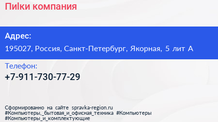 Пиlки, компания по адресу 195027, Россия, Санкт-Петербург, Якорная, 5 лит А в дальнейшем Организация, размещена в следующих категориях: