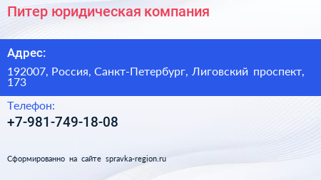 Питер, юридическая компания по адресу 192007, Россия, Санкт-Петербург, Лиговский проспект, 173 в дальнейшем Организация, размещена в следующих категориях: