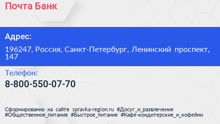 Почта Банк по адресу 196247, Россия, Санкт-Петербург, Ленинский проспект, 147 в дальнейшем Организация, размещена в следующих категориях: