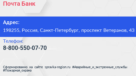 Почта Банк по адресу 198255, Россия, Санкт-Петербург, проспект Ветеранов, 43 в дальнейшем Организация, размещена в следующих категориях: