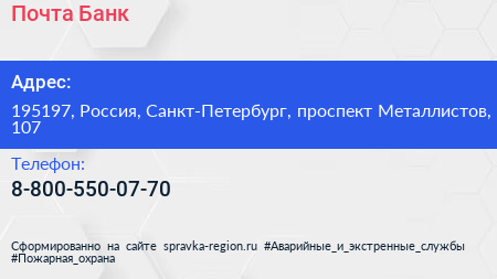 Почта Банк по адресу 195197, Россия, Санкт-Петербург, проспект Металлистов, 107 в дальнейшем Организация, размещена в следующих категориях:
