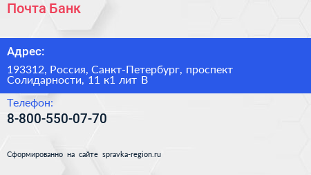 Почта Банк по адресу 193312, Россия, Санкт-Петербург, проспект Солидарности, 11 к1 лит В в дальнейшем Организация, размещена в следующих категориях: