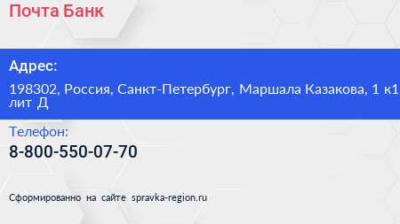 Почта Банк по адресу 198302, Россия, Санкт-Петербург, Маршала Казакова, 1 к1 лит Д в дальнейшем Организация, размещена в следующих категориях: