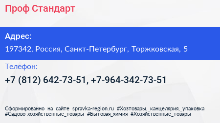 Проф-Стандарт по адресу 197342, Россия, Санкт-Петербург, Торжковская, 5 в дальнейшем Организация, размещена в следующих категориях: