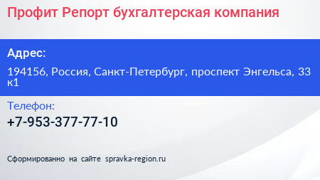 Профит Репорт, бухгалтерская компания по адресу 194156, Россия, Санкт-Петербург, проспект Энгельса, 33 к1 в дальнейшем Организация, размещена в следующих категориях: