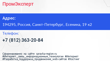 ПромЭксперт по адресу 194295, Россия, Санкт-Петербург, Есенина, 19 к2 в дальнейшем Организация, размещена в следующих категориях: