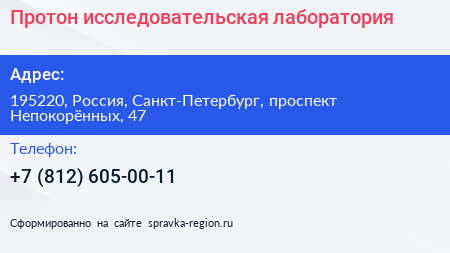 Протон, исследовательская лаборатория по адресу 195220, Россия, Санкт-Петербург, проспект Непокорённых, 47 в дальнейшем Организация, размещена в следующих категориях: