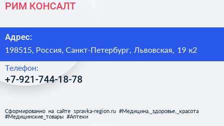 РИМ КОНСАЛТ по адресу 198515, Россия, Санкт-Петербург, Львовская, 19 к2 в дальнейшем Организация, размещена в следующих категориях: