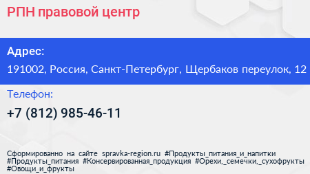 РПН, правовой центр по адресу 191002, Россия, Санкт-Петербург, Щербаков переулок, 12 в дальнейшем Организация, размещена в следующих категориях: