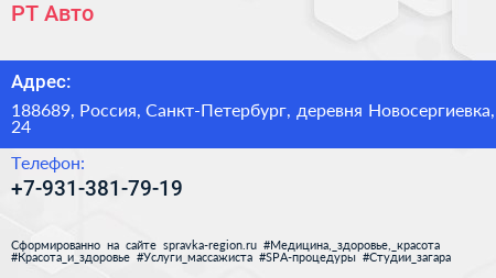 РТ-Авто по адресу 188689, Россия, Санкт-Петербург, деревня Новосергиевка, 24 в дальнейшем Организация, размещена в следующих категориях: