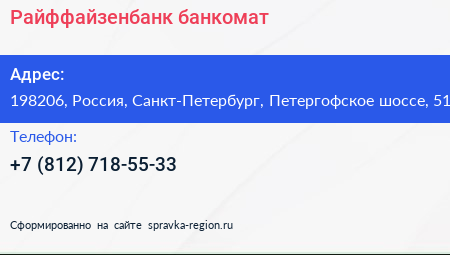 Райффайзенбанк, банкомат по адресу 198206, Россия, Санкт-Петербург, Петергофское шоссе, 51 в дальнейшем Организация, размещена в следующих категориях: