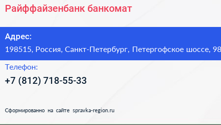 Райффайзенбанк, банкомат по адресу 198515, Россия, Санкт-Петербург, Петергофское шоссе, 98 в дальнейшем Организация, размещена в следующих категориях: