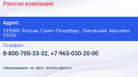 Риотон, компания по адресу 191040, Россия, Санкт-Петербург, Лиговский проспект, 43/45 в дальнейшем Организация, размещена в следующих категориях: