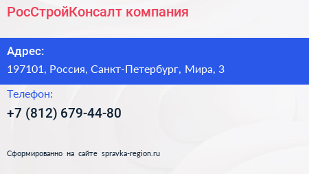 РосСтройКонсалт, компания по адресу 197101, Россия, Санкт-Петербург, Мира, 3 в дальнейшем Организация, размещена в следующих категориях: