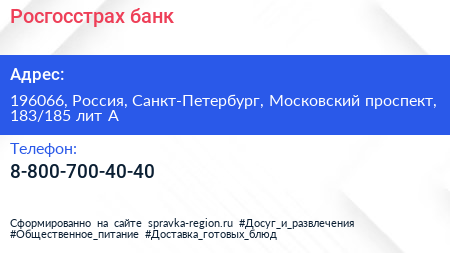 Росгосстрах банк по адресу 196066, Россия, Санкт-Петербург, Московский проспект, 183/185 лит А в дальнейшем Организация, размещена в следующих категориях: