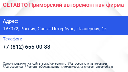 СЕТАВТО Приморский, авторемонтная фирма по адресу 197372, Россия, Санкт-Петербург, Планерная, 15 в дальнейшем Организация, размещена в следующих категориях: