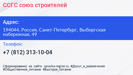 ССГС, союз строителей по адресу 194044, Россия, Санкт-Петербург, Выборгская набережная, 49 в дальнейшем Организация, размещена в следующих категориях: