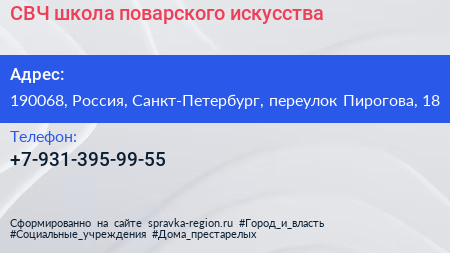 СВЧ, школа поварского искусства по адресу 190068, Россия, Санкт-Петербург, переулок Пирогова, 18 в дальнейшем Организация, размещена в следующих категориях: