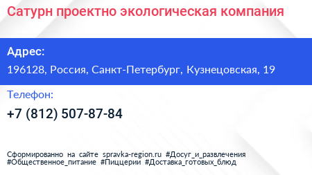 Сатурн, проектно-экологическая компания по адресу 196128, Россия, Санкт-Петербург, Кузнецовская, 19 в дальнейшем Организация, размещена в следующих категориях: