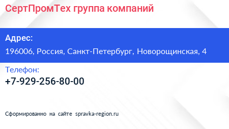 СертПромТех, группа компаний по адресу 196006, Россия, Санкт-Петербург, Новорощинская, 4 в дальнейшем Организация, размещена в следующих категориях: