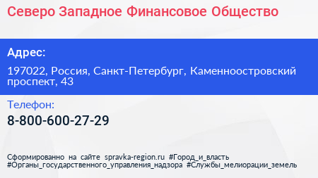 Северо-Западное Финансовое Общество по адресу 197022, Россия, Санкт-Петербург, Каменноостровский проспект, 43 в дальнейшем Организация, размещена в следующих категориях: