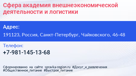 Сфера, академия внешнеэкономической деятельности и логистики по адресу 191123, Россия, Санкт-Петербург, Чайковского, 46-48 в дальнейшем Организация, размещена в следующих категориях: