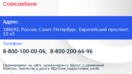 Совкомбанк по адресу 188692, Россия, Санкт-Петербург, Европейский проспект, 13 к5 в дальнейшем Организация, размещена в следующих категориях: