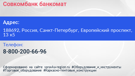 Совкомбанк, банкомат по адресу 188692, Россия, Санкт-Петербург, Европейский проспект, 13 к5 в дальнейшем Организация, размещена в следующих категориях: