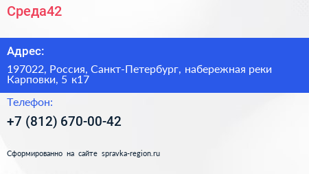 Среда42 по адресу 197022, Россия, Санкт-Петербург, набережная реки Карповки, 5 к17 в дальнейшем Организация, размещена в следующих категориях:
