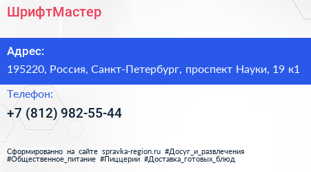 ШрифтМастер по адресу 195220, Россия, Санкт-Петербург, проспект Науки, 19 к1 в дальнейшем Организация, размещена в следующих категориях: