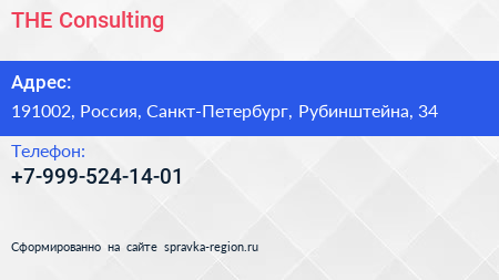 THE Consulting по адресу 191002, Россия, Санкт-Петербург, Рубинштейна, 34 в дальнейшем Организация, размещена в следующих категориях: