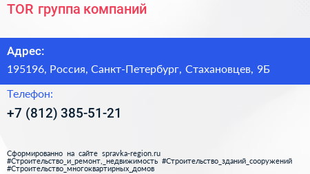 TOR, группа компаний по адресу 195196, Россия, Санкт-Петербург, Стахановцев, 9Б в дальнейшем Организация, размещена в следующих категориях: