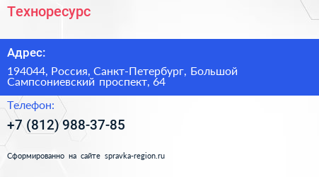 Техноресурс по адресу 194044, Россия, Санкт-Петербург, Большой Сампсониевский проспект, 64 в дальнейшем Организация, размещена в следующих категориях: