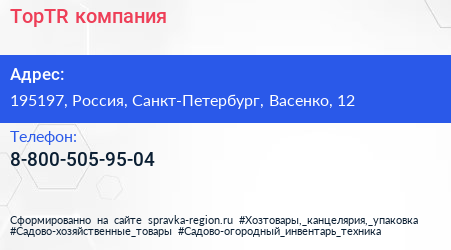 TopTR, компания по адресу 195197, Россия, Санкт-Петербург, Васенко, 12 в дальнейшем Организация, размещена в следующих категориях:
