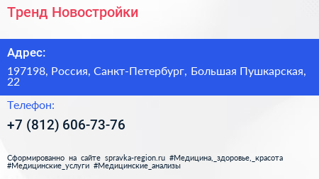 Тренд Новостройки по адресу 197198, Россия, Санкт-Петербург, Большая Пушкарская, 22 в дальнейшем Организация, размещена в следующих категориях: