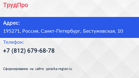 ТрудПро по адресу 195271, Россия, Санкт-Петербург, Бестужевская, 10 в дальнейшем Организация, размещена в следующих категориях: