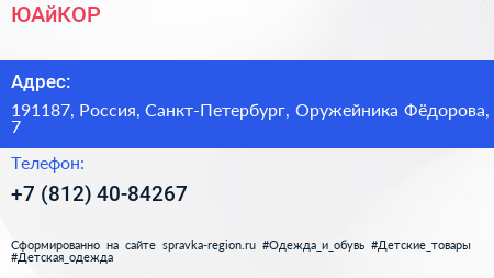 ЮАйКОР по адресу 191187, Россия, Санкт-Петербург, Оружейника Фёдорова, 7 в дальнейшем Организация, размещена в следующих категориях: